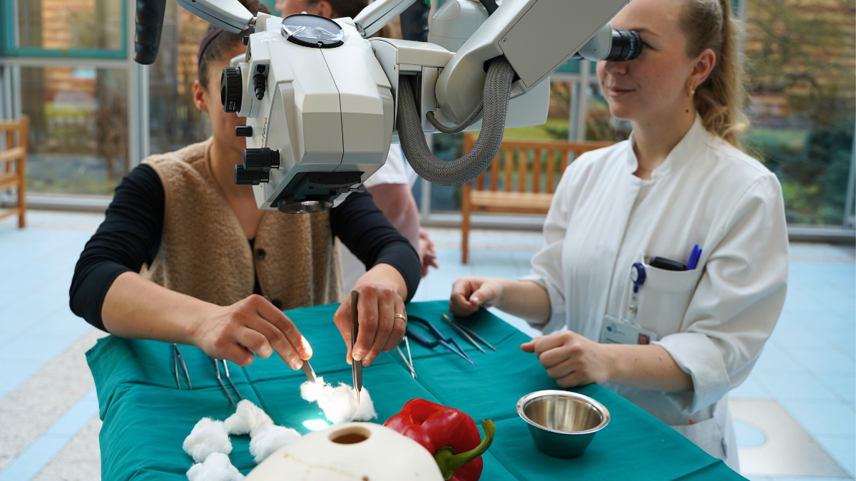 Im interprofessionellen mikrochirurgischen Skills-Lab sollen die Fertigkeiten der angehenden Operationstechnischen Assistentinnen und Assistenten (OTA) und der angehenden Fachärztinnen und Fachärzte der mikrochirurgischen operativen Fachrichtungen (Neurochirurgie, Hand-, Replantations- und Mikrochirurgie, Hals-Nasen-Ohrenheilkunde und Mund-Kiefer-Gesichts-Chirurgie) gemeinsam an modernen Geräten und Instrumenten erlernt und verfeinert werden. Auszubildende der Assistenzberufe und junge Ärztinnen und Ärzte lernen im ukb von Anfang an, Hand in Hand auf Augenhöhe zusammenzuarbeiten. |